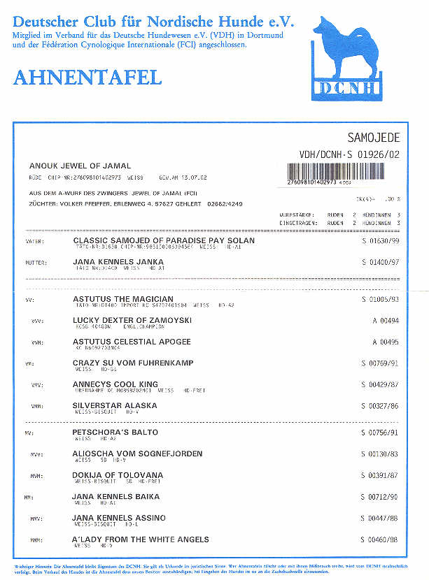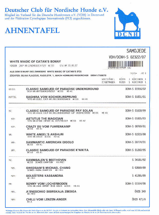 Auszug aus der Zuchtzulassung vom 13.01.2009
