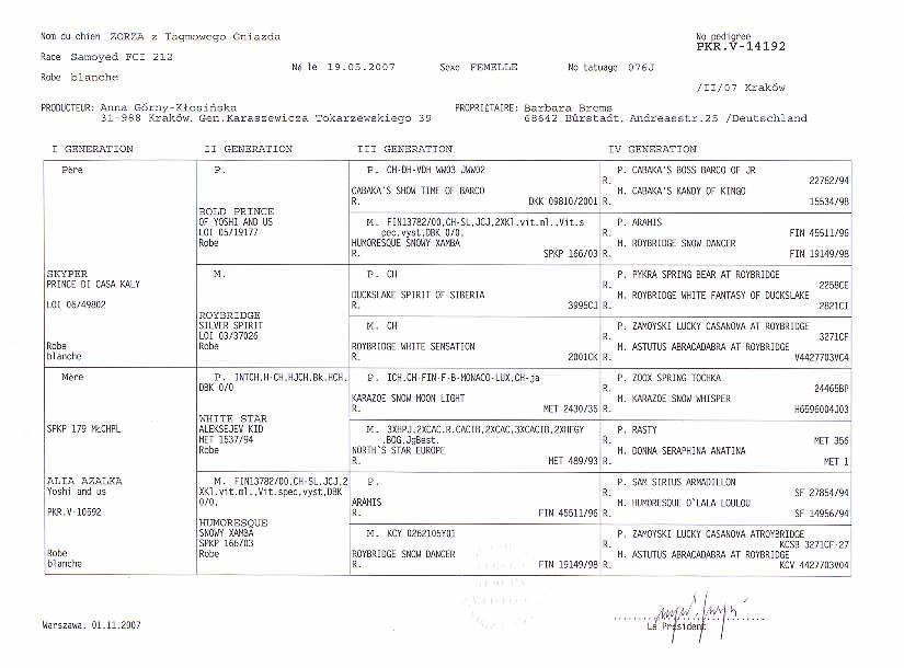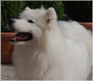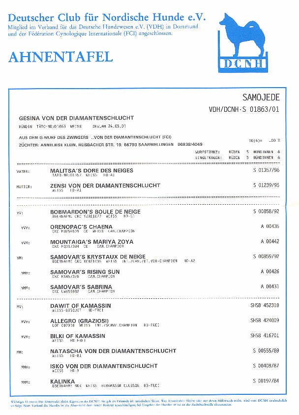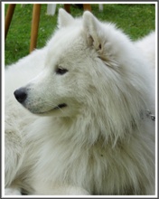 Gesamtverfassung: ansprechende Hündin mit sehr gutem Rassetyp Gebäude: rechteckig, gut proportioniert Fellfarbe: weiß Pigment: kräftig Wesen: freundlich, ruhig Typ, Ausdruck: feminin Knochenbau: mittelkräftig, zum Körper passend Bemuskelung: sehr kräftig Kopf: feminin mit ansprechendem Ausdruck, keilförmig Gebiss: vollständiges Scherengebiss Augen: dunkelbraun, mandelförmig Ohren: dreieckig, gut eingesetzt und getragen Hals: zu kurz Rücken: gerade Rute, Rutenansatz: gut angesetzt und getragen Vorderhand: Hinterhand: sehr gut gestellt und gewinkelt sehr gut gestellt und gewinkelt Pfoten: oval Gangwerk: parallel, ausgreifend Behaarung: artgerecht ZZL bis: 01/2011