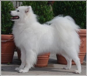 Gesamtverfassung: ansprechende Hündin von korrekten Proportionen und Knochenstärke Gebäude: rechteckig Fellfarbe: weiß Pigment: kräftig Wesen: freundlich, ausgeglichen Typ, Ausdruck: feminin Knochenbau: mittelkräftig, zum Körper passend Bemuskelung: sehr kräftig Kopf: feminin, ausdrucksvoll Gebiss: vollständiges Scherengebiss Augen: dunkelbraun, mandelförmig, gut eingesetzt Ohren: dreieckig, gut eingesetzt und getragen Hals: mittellang Rücken: gerade Rute, Rutenansatz: hoch angesetzt und richtig getragen Vorderhand: Hinterhand: vorzüglich gestellt und gewinkelt vorzüglich gestellt und gewinkelt Pfoten: oval, etwas durchgetreten Gangwerk: flüssig, raumgreifend, vorn leicht eingedreht Behaarung: artgerecht ZZL bis: 01/2011